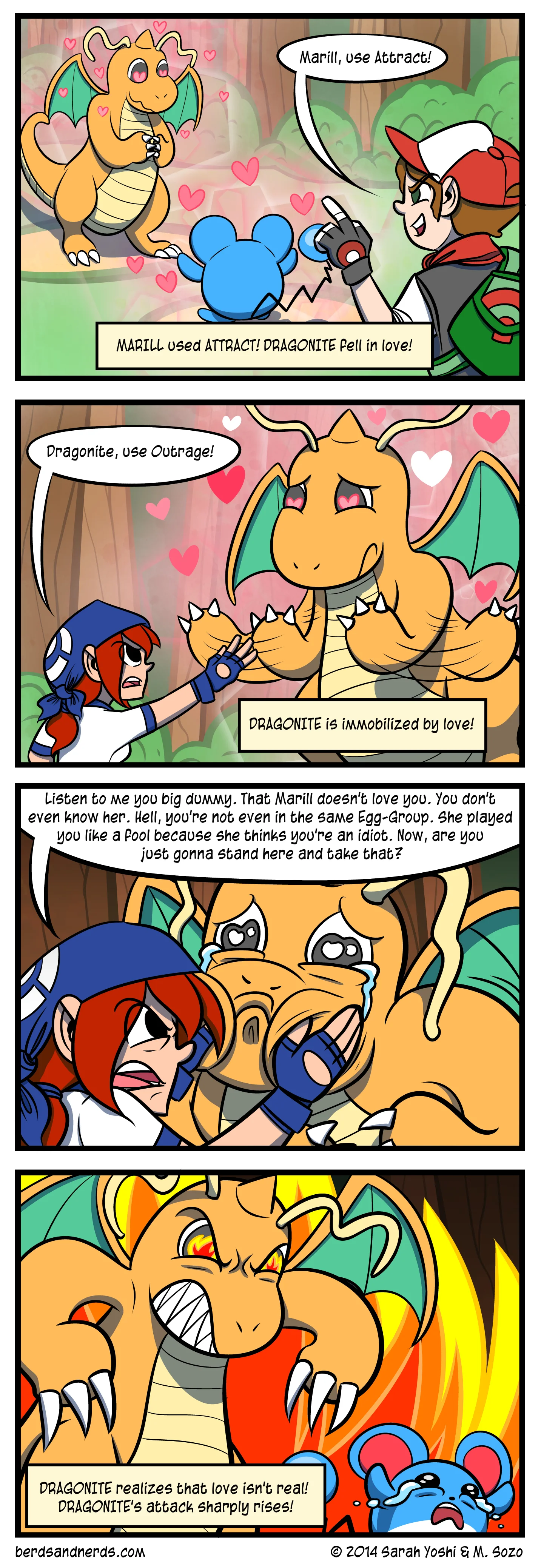 Love is a Battlefield Artist's Note: I won't lie, I love creating Pokemon comic strips. Also I love drawing adorable Pokemon, especially round characters, like Marill. O(≧▽≦)O Writer's Note:Silly Marill. Hell hath no fury like a Dragonite scorned. Posted on December 4, 2014 by Sarah Yoshi.