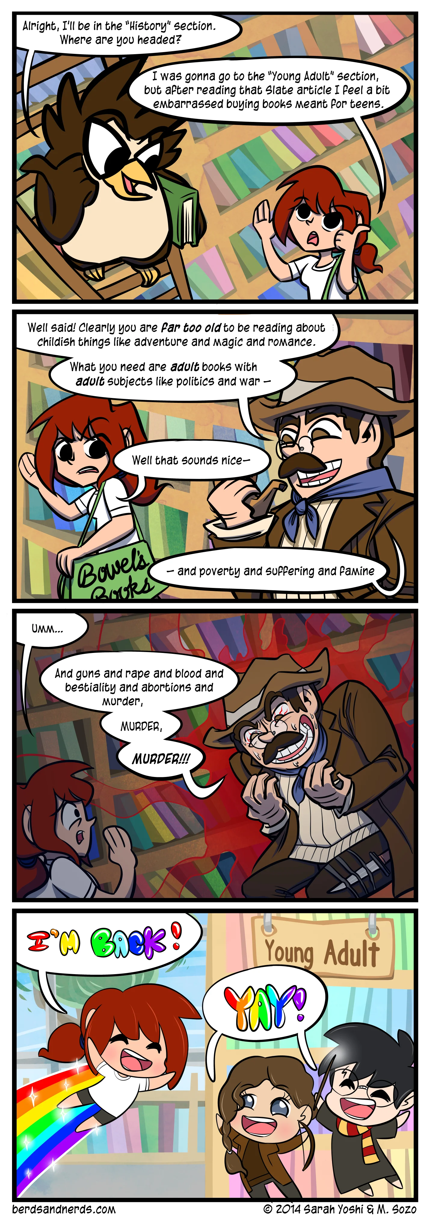 I am an adult guilty of reading YA novels. The first one was a freebie. Twilight. A fast read, absurd story, but it was too late. I got hooked. The first pages were smooth and the hit was sweet, but the high dulled quickly. You desperately look for your next fix, and the next, and before you know it, you're writing fanfiction.