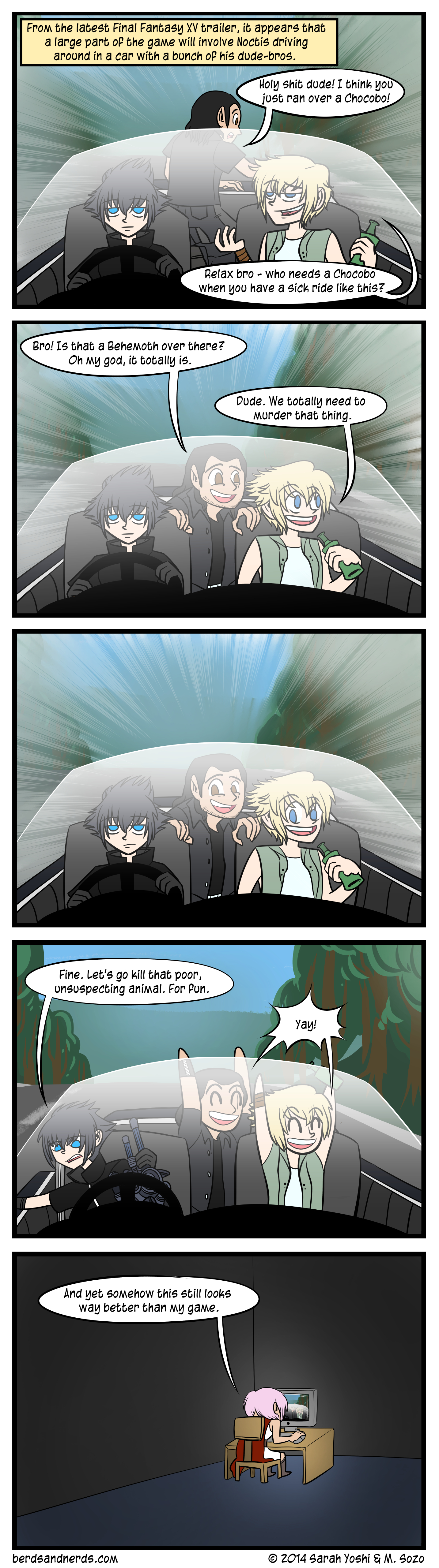 It's a Low Bar Artist's Note: Bro, this game looks super dope. Maybe they'll have DLCs for different models, and colors like chocobo-yellow? It'll be hellah sweet!(but in all seriousness, dunno how I feel about this game right now) Writer's Note: Posted on September 22, 2014 by Sarah Yoshi and tagged Final Fantasy XV Noctis Lucis Caelum Gladiolus Amicitia Prompto Argentum Lightning.