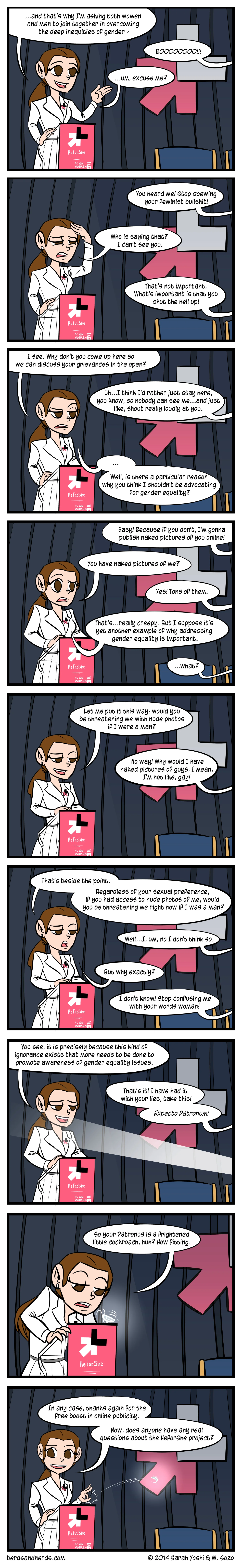 Kind of a rush job on the writing for this comic. I wasn't able to get the tone right for the faceless heckler, and after reading through the comic again, I think my word economy could have been a lot better since some of the lines don't read naturally.
