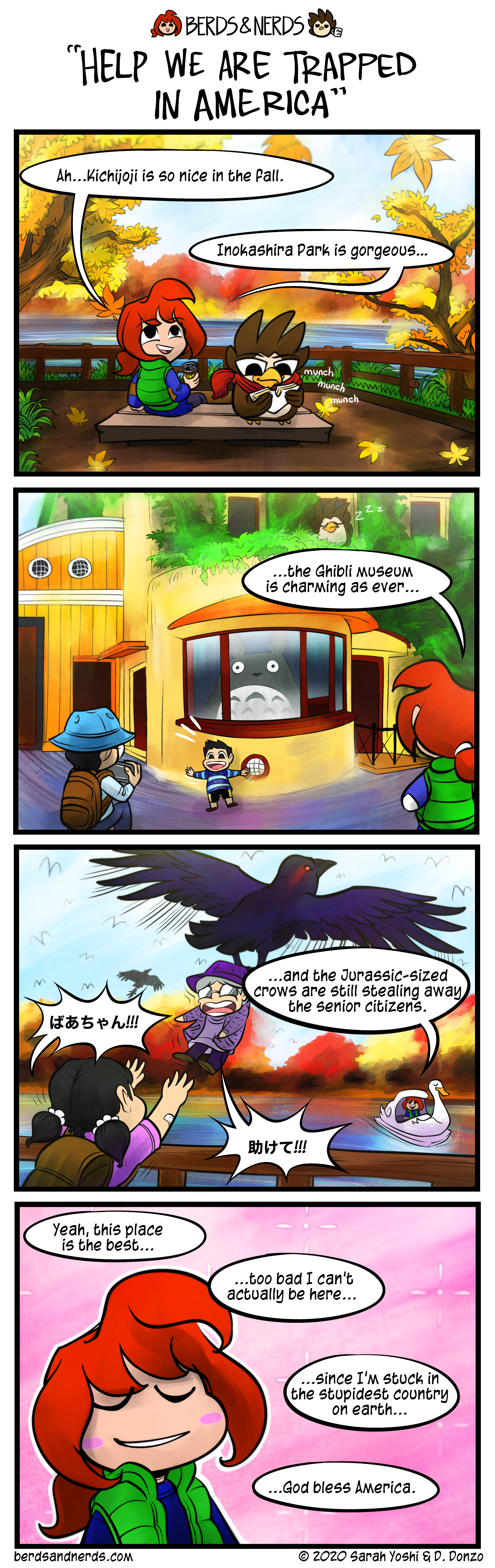 Help We Are Trapped In America Artist's Note:If this isn’t a cry for help I don’t know what is honestly~ Writer's Note:As we head into flu season I think our collective unconscious will increasingly be doing the inverted version of the “Let Me In” meme. Posted on October 19, 2020 by Sarah Yoshi and filed under Video Games and tagged Webcomic 2020 Lark Locke Japan Japanese Garden Kichijoji Inokashira Park Ghibli Ghibli Museum Kichijoji Park Crows America United States Stupidest Country on Earth.