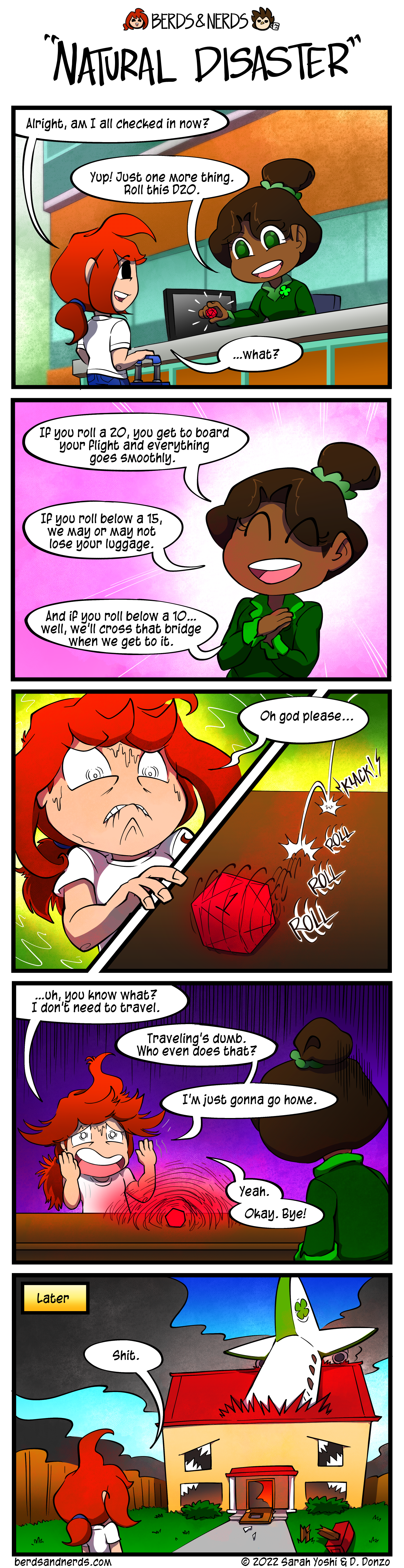 Natural Disaster Artist's Note:Not my best work, but TRYIIIIIIIIIIING Writer's Note:Gotta love how air travel has evolved into a series of negative lotteries. Makes me even more envious of places with excellent rail infrastructure, though ironically the only way to get there from the US is by flying. Posted on August 15, 2022 by Sarah Yoshi and filed under Current Events and tagged Berds and Nerds 2022 Airport Airplanes D20 Dungeons and Dragons.